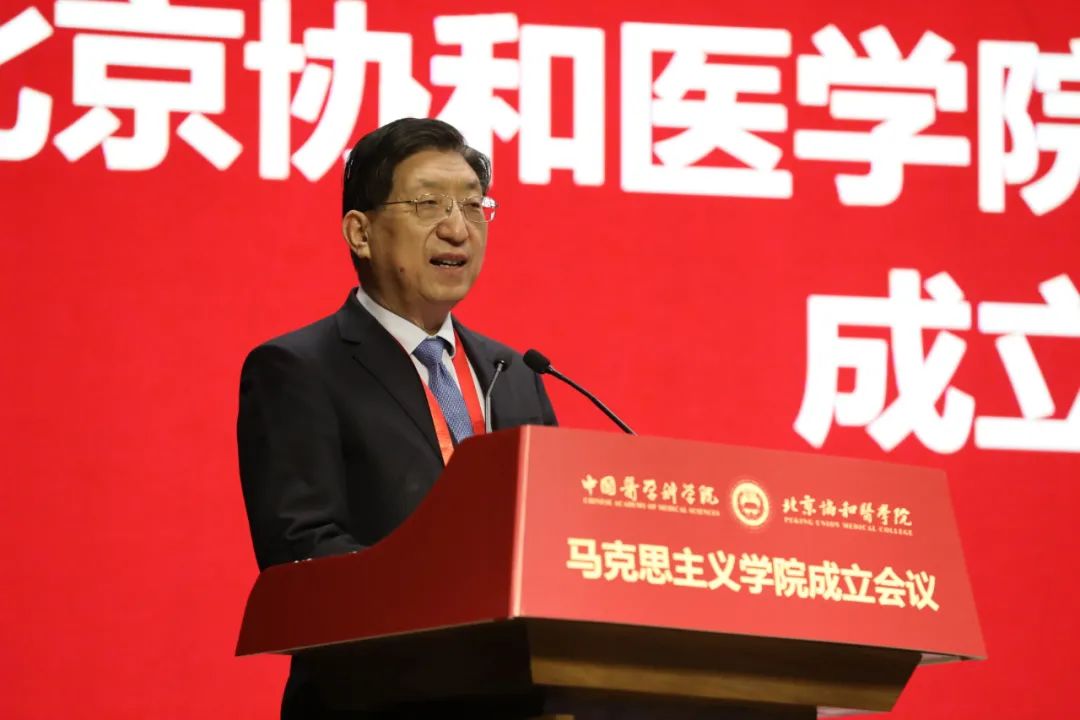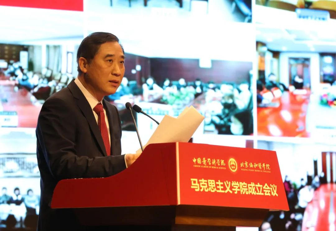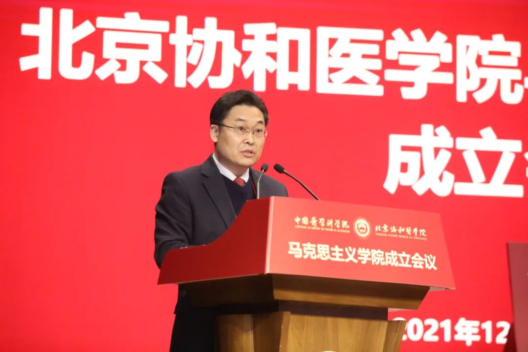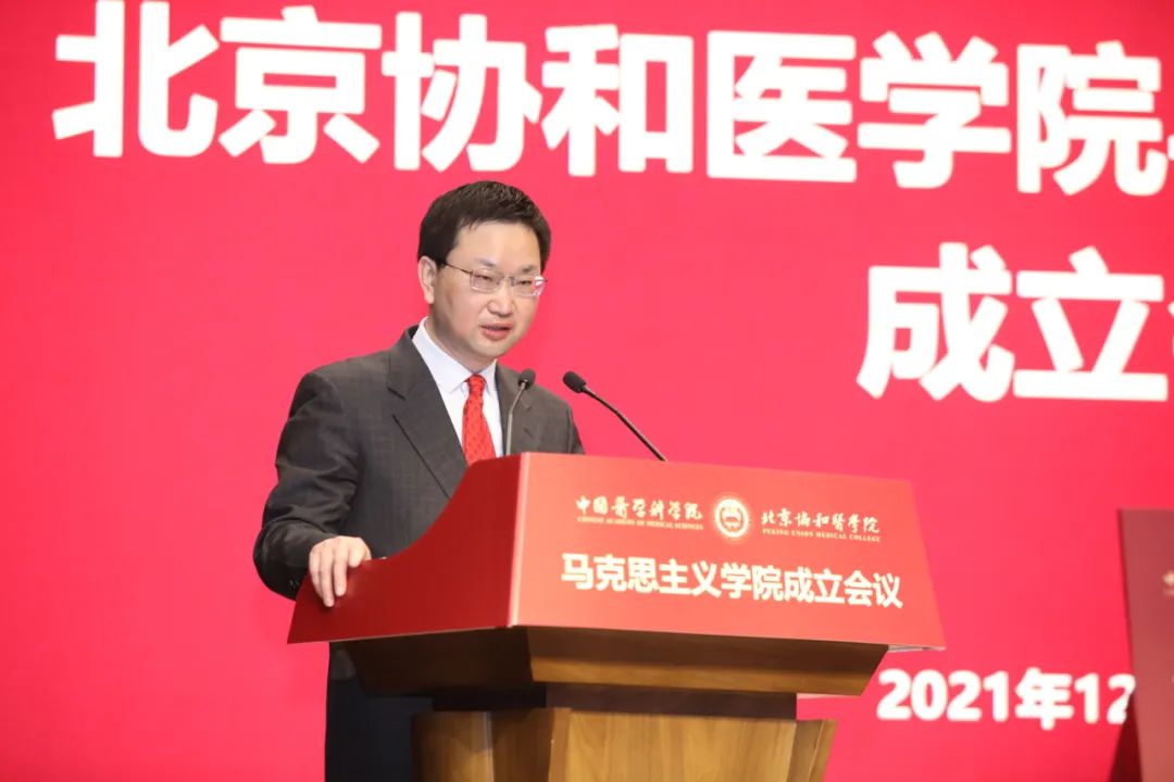 會上,國家衛(wèi)生健康委直屬機關黨委常務副書記楊建立宣讀國家衛(wèi)生健康委黨組書記、主任馬曉偉批示。馬曉偉指出,北京協(xié)和醫(yī)學院成立馬克思主義學院是在新時代新征程上全面貫徹習近平新時代中國特色社會主義思想,落實《關于加強新時代馬克思主義學院建設的意見》的重大舉措。要認真學習貫徹黨的十九屆六中全會精神,堅持正確辦學方向,堅持和加強黨的全面領導,聚焦馬克思主義中國化時代化最新成果的學習研究宣傳,切實發(fā)揮思想政治理論課立德樹人關鍵課程作用和馬克思主義理論學科引領作用,大力弘揚和傳承百年協(xié)和的優(yōu)秀基因和精神內核。